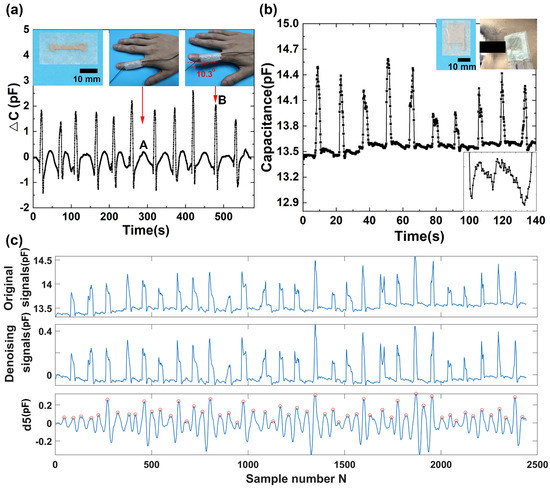 In addition, spontaneous eye blinking is considered to be a suitable indicator for fatigue diagnostics during many tasks of human being activity, and the measurement of an eye blink parameter provides reliable information for eye-controlled systems from a human–machine interface. The system may be used for detecting basic commands to control some instruments, robots, or any other applications by people with limited upper-body mobility. We applied the as-fabricated sensor to detect eye blinking. The sensor was attached to the temple of a volunteer by a PU tape (Figure 4b). A precision LCR meter connected to the sensor by wires was used to record the capacitance of the sensor. Eye blinking caused the muscles’ movements around the eye, which changed the distance between the electrode plates. Significant increases of the capacitances were obtained during eye blinking. The repeated eye blinking produced a similar capacitive response. The capacitance peak values of the sensor responding to eye blinking are a little different due to the various intensities of eye blinking. During the unblinking process, the capacitances are at the baseline state. More interestingly, there seems a regular signal in the baseline. We further enlarge one part of the baseline, and a regular signal is shown in the enlarged image in Figure 4b. To further investigate the signal, we take advantage of wavelet transform to analyze the recorded signals. Wavelet technique has been widely employed to analyze various physiological signals [41]. The method is preferred over signal frequency domain filtering because it can maintain signal characteristics even while reducing noise [42]. Wavelet transform employs extensive time windows for low frequencies; and short time windows for higher frequencies, resulting in good time-frequency analysis [43]. The output of the first high pass and low pass filters are referred to as the approximation and detailed coefficients, represented by a1 and d1, respectively. The a1 is further disintegrated, and the procedure is repeated until the specified number of decomposition levels is reached. In this experiment, wavelet functions Daubechies wavelet db8 is used for the wavelet transform. After wavelet decomposition of 8 levels, the original signal is decomposed into low-frequency approximation coefficients a1–a8 (Figure S3) and high-frequency detail coefficients d1–d8 (Figure S4). The noisy signal corresponding to the relevant part of the low-frequency detail a8 is removed from the recorded eye blinking signals, and the remaining parts are reconstructed to obtain the denoising signal (Figure 4c). The sequence of the eye blinking wave is a long repeatedly blinking wave. The high-frequency detail coefficients at level 5 are isolated and shown in Figure 4c. By calculating the characteristic peaks marked with circles in d5, we can obtain that the frequency of the signal is 70 times per minute. The analytical result coincides well with the pulse rate of a healthy person, whose pulse rate locates in the range from 60 to 100 times per minute.