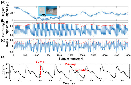 Detection and analysis of wrist pulse acquired by the capacitive sensor. (a) The recorded wrist pulse. (b) The wrist pulse after denoising and drift removal. (c) The 5th level wavelet high-frequency coefficient decomposed from the recorded wrist pulse signal (d5). (d) The enlarged denoising wrist pulse.