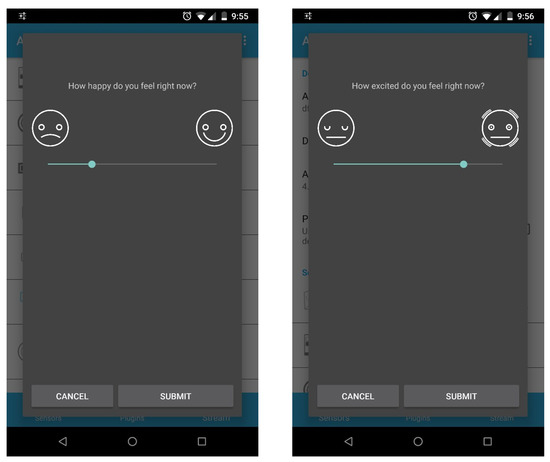 In order to continuously monitor the affective states, individuals have to evaluate the two aforementioned affect dimensions repeatedly over time. To that end, our system takes advantage of the Experience Sampling Method (ESM), also known as Ecological Momentary Assessment (EMA), to prompt a questionnaire on the individual’s mobile phone at a desired time. The questionnaire asks for the input of the self-perceived value of both affect dimensions. Its usefulness beyond traditional paper-based questionnaires for real-time assessment has been successfully explored in recent works [33]. Currently, the ESM questionnaire of this work includes two questions to measure the affect dimensions following the circumplex model: valence and arousal. Traditionally, these dimensions have been measured using a Likert scale [9]. However, given the potential of the mobile technologies, we use a 100-point bipolar scale which is selected using a slider bar. The ESM feature of the AWARE framework allows for the creation of slider-based ESMs. However, we have added extra features to this response format in order to adapt it to the affect monitoring. Instead of showing the numerical value of the scale, we place a simple face icon at each extreme of the slider, whose expressions represent the maximum and minimum values of the scale (Figure 4). For example, in the valence question, the minimum value is represented with a sad face and the maximum one, with a happy face; the arousal question depicts a calm face and an excited face, respectively. Emoticon-based questions have been proved to be more intuitive and user-friendly than numeric based ones [34]. Moreover, although the value of the scale ranges from 0 to 100, it can be interpreted as a bipolar negative-positive scale, clearly communicating the bipolarity to the respondents [35]. Finally, since the ESM is triggered several times per day, the user can get used to the same response if the slider always starts at the same point like the middle or the beginning. To avoid that, a setting has been added to set a random starting point of the slider. A limited set of values can also be specified, and the slider will randomly start from one of these points.