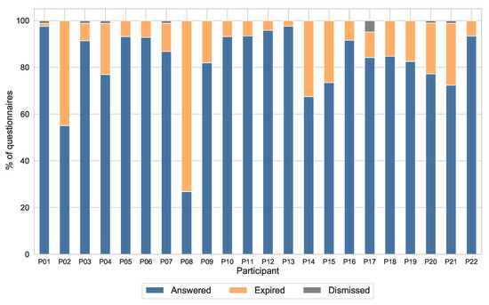 Percentage of questionnaires answered (blue), expired (orange) and actively dismissed (grey) for each participant during the entire study.