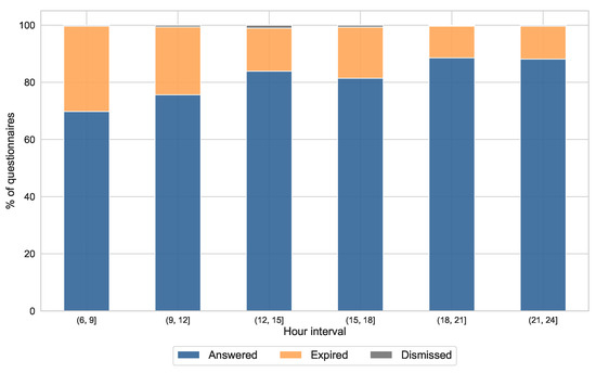 Overall percentage of questionnaires answered (blue), expired (orange) and actively dismissed (grey) per interval of daily hours.