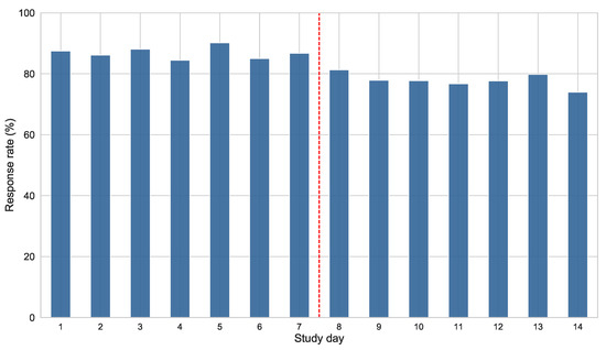 The response rate also fluctuates during the course of the study. Figure 8 shows the evolution of the overall response rate as the study goes on. The central vertical line emphasizes the distinction between the two weeks covered by the study. It can be seen that the response rate keeps significantly high during the first week of the study, experiencing a progressive decrease in the second week. The mean response rates for each week are 86.9% and 77.9%, respectively. The previously mentioned reminder of the end of the study was sent on day 13. This reminder could explain the slight increase of responses appreciated in this day, as the participants started again to keep the questionnaires in mind.