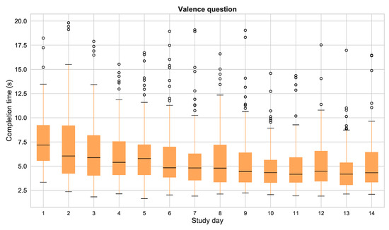 Completion times of the questionnaires per day of study for the valence question. Times over 300 s have not been considered.