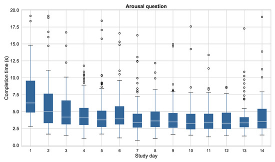 Completion times of the questionnaires per day of study for the arousal question. Times over 300 s have not been considered.