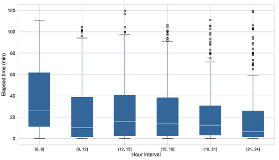 For this evaluation, the time elapsed between the arrival of the notification to the time when the participant clicks on it and respond the questionnaire has also been measured. As the notification of the ESM persisted for 120 min after its reception, they could be responded out of the triggering intervals, thus modifying the time distribution of the samples. Computing the elapsed time from the notification to the response, we can get an idea on when the participants actually answer the questionnaires. It should be taken in consideration that this analysis only includes the questions that have been responded or dismissed, since the ones that expired do not have response time. Figure 11 depicts the elapsed times versus the hour of the day when the notification was triggered.