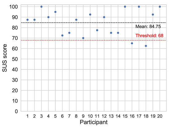 The average standardized SUS score is 68 [54,55]. A system with a score over this value is considered to have a good usability level. Moreover, systems who exceed a SUS score of 80.3 are considered to have an excellent usability level. Regarding the app and the plugin, the SUS scores given by each participant of the study after computing their overall value are shown in Figure 12. The black dashed line indicates the mean value of the SUS scores given to our system, and the red one indicates the aforementioned good usability threshold. It can be seen that only two out of the twenty ratings are under 68, and the mean SUS score given to the system is 84.75. These values represent high levels of acceptability and ease of use, thus indicating that the usability of the system seems to be highly favorable for the end users.
