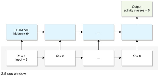 In this section, we propose how to build an LSTM model used for on-device inference. We employ the open dataset provided by the wireless sensor data mining (WISDM) Lab [12] to build an activity recognition model for on-device deep learning inference. A schematic diagram of the proposed LSTM-based deep learning model for activity recognition system is depicted in Figure 2.