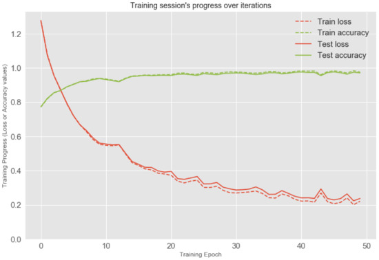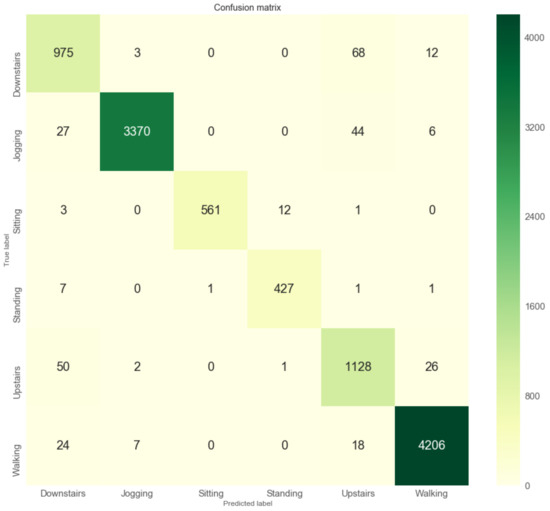 For validating the trained model against test data, we apportion the data into training and test sets, with an 80–20 split. After each epoch of training, we evaluate the performance of the model on the validation set. We select the epoch that showed the best validation-set performance and apply the corresponding model to the test-set. As a result, we opt the final epoch that the accuracy and weighted F1-score both are reached over 97% (0.975 and 0.972, respectively) and loss is hovered at around 0.2. Note that the class distribution of the WISDM dataset has the sample imbalances among activity classes which can affect machine learning [34]. We could not collect more data that could balance our classes; however, we show the weighted F1-score for additional performance metric that is preferable if there is a class imbalance problem, not just only accuracy [35]. Since the smartphone is attached on the waist and each series to classify has just a 200 sample window, those predictions are extremely accurate. If we have a look at the confusion matrix of the model’s predictions in Figure 4, we can see that our model performs really well. Although we can see some notable exceptions that there are difficulties in making the difference between walking, upstairs and downstairs, the model is almost always able to identify the movement type on a smartphone correctly. The visual insight of the results are presented in Figure 4 and Figure 5.
