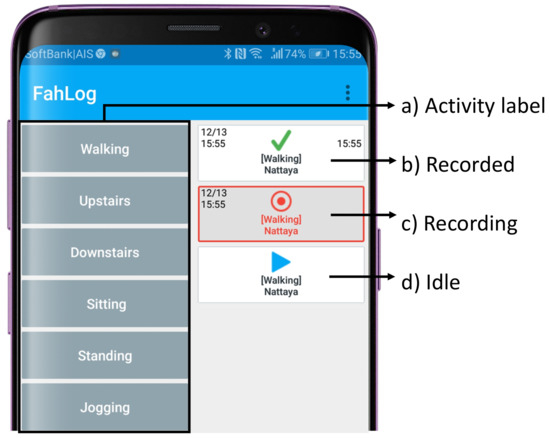 We requested participants to carry a waist-mounted Android smartphone (Wiko Tommy3 Plus (Android 8.1)) with embedded inertial sensors, install the mobile app on smartphones to select and record their daily life activities from the list of predefined labels. Information about the demography of participants and the duration of the experiment are reported in Section 4. The mobile app is extended from our work [36] called “FahLog”, as shown in Figure 6, when a user selects the activity in Figure 6a, the labels for each activity class will be put into the right column as shown in Figure 6d. Then the user has to record it by pushing the button to start and stop recording while they are carrying out the activity by following the steps as shown in Figure 6b–d. Each time the user taps an activity label box, it will transition to before start (▶) → doing activity (⊙) → finish (✓) so a user can record the start and end of the activity. Since another activity may be performed while performing one activity, multiple activity labels can be started and ended in parallel. The activity labels can then be uploaded to the server when it is connected to the network. Otherwise, data will be stored on the smartphone until there is internet access. Moreover, we capture sensors and activity labels through smartphones to recognize activities using smartphone sensors continuously. Hence, we set the sampling rate of the app for the ‘standard’ settings of Android programming API, which is the slowest setting, where they are sampled 200 milliseconds when they are not busy, then we take one minute time windows for calculating time windows, it is enough of a sampling rate for such data collection. Note that the FahLog annotation tool will be unexpired and can be applied for other activity data collection experiments such as crowdsourcing [37] or nursing cares [38]. Also, it provides on Google Play openly [39]. It can alter multiple activity types from our server configuration connected to the app that has already been set up [40] as well as it can modify the user interface of the tool for each specific purpose (e.g., in this paper, adding notifications for showing estimated activities as feedback). More features have been published in [36].