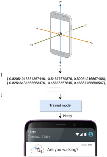 The application of deep learning for human activity recognition has been effective in extracting discriminative features from raw input sequences acquired from body-worn sensors. Researchers have been adopting deep learning methods for activity recognition [11,25,26]. Recognizing human activities user-independently on smartphones based on accelerometer data using LSTM networks are well-suited [27]. Thus, we will focus on an LSTM-based deep learning model for activity recognition in this study; however, there are lots of challenges on both steps in a scenario of complex data and lacking sufficient domain knowledge. While the authors of [27] proposed an LSTM-based feature extraction approach to recognize human activities using three-axial accelerometer data, and showed the method could achieve high accuracy. Previously, [28] pointed to recognizing multiple overlapping activities using an algorithm of a compositional CNN + LSTM. However, using an LSTM for on-device inference is deficient. The authors of [29] introduced RSTensorFlow: an accelerated deep learning framework on commodity android devices using the heterogeneous computing framework RenderScript. The authors of [30] explored optimizations to run recurrent neural network (RNN) models locally on mobile devices for activity recognition. While they point to the significant issues in the performance of running different models architectures for Android devices while running deep learning models, we will present differences both on applications and purpose. While many of their research questions were similar to ours in using an LSTM-based deep learning model for activity recognition in various application domains, yet, no one has studied the use of on-device deep learning inference as feedback for activity data collection by giving estimated activities are inferred through notifications, which we will present in this paper.
