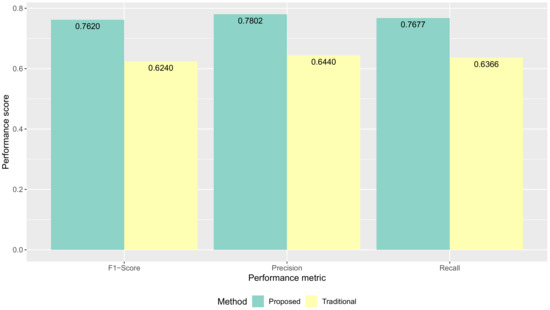Figure 9 shows F1-score, precision, and recall performance results of all machine learning models were improved with our proposed method compared to the traditional method. The F1-score was improved from 0.6240 to 0.7620 (+0.138) The precision was improved from 0.6440 to 0.7802 (+0.136) The recall of improved from 0.6366 to 0.7677 (+0.131).