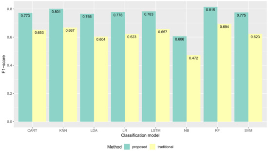 Figure 10 shows F1-score performance results of all machine learning models were improved with our proposed method compared to the traditional method. The F1-score of CART was improved from 0.657 to 0.770 (+0.113) The F1-score of KNN was improved from 0.667 to 0.801 (+0.134). The F1-score of LDA was improved from 0.604 to 0.766 (+0.162). The F1-score of LR was improved from 0.623 to 0.778 (+0.155). The F1-score of LSTM was improved from 0.657 to 0.783 (+0.126). The F1-score of NB was improved from 0.472 to 0.606 (+0.134). The F1-score of RF was improved from 0.694 to 0.815 (+0.121). The F1-score of SVM was improved from 0.623 to 0.775 (+0.152).