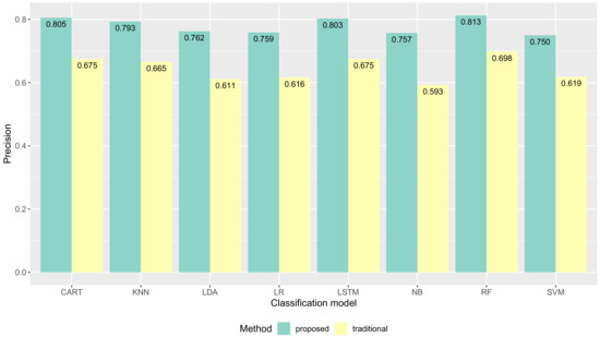 Figure 11 shows precision performance results of all machine learning models were improved with our proposed method compared to the traditional method. The precision of CART was improved from 0.679 to 0.805 (+0.126). The precision of KNN was improved from 0.665 to 0.793 (+0.128). The precision of LDA was improved from 0.611 to 0.762 (+0.151). The precision of LR was improved from 0.616 to 0.759 (+0.143). The precision of LSTM was improved from 0.675 to 0.803 (+0.128). The precision of NB was improved from 0.593 to 0.757 (+0.164). The precision of RF was improved from 0.698 to 0.813 (+0.114). The precision of SVM was improved from 0.619 to 0.738 (+0.119).