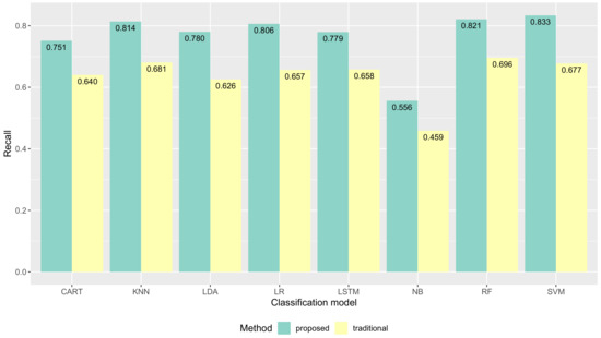 Figure 12 shows recall performance results of all machine learning models were improved with our proposed method compared to the traditional method. The recall of CART was improved from 0.648 to 0.746 (+0.098). The recall of KNN was improved from 0.681 to 0.814 (+0.133). The recall of LDA was improved from 0.626 to 0.780 (+0.154). The recall of LR was improved from 0.657 to 0.806 (+0.149). The recall of LSTM was improved from 0.657 to 0.779 (+0.121). The recall of NB was improved from 0.459 to 0.556 (+0.097). The recall of RF was improved from 0.696 to 0.821 (+0.137). The recall of SVM was improved from 0.677 to 0.833 (+0.156).