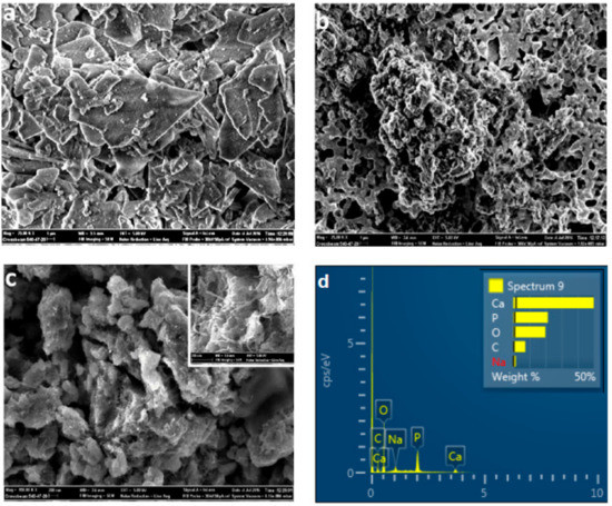 At higher magnification (scale bar 200 nm) MWCNTs can be easily imaged (inset in Figure 3c provide better details for this). EDX elemental analysis (Figure 3d) shows the presence of Ca, P, and O elements, typical of HA and C coming from graphene and MWCNTs. Based on SEM observations, it appears that the graphene oxide sheets act as a substrate to support and disperse HA, whereas CNTs act as bridges between them.