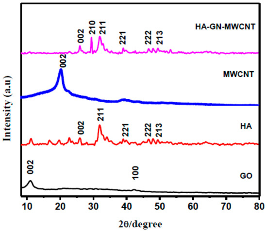 XRD patterns of HA-GN-MWCNT composite sample and single components.