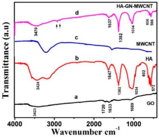 FT-IR analysis has been carried out to acquire additional information on the microstructure and functional groups present in the individual components and the ternary composite (Figure 5). The oxygen-containing functional group characteristics of GO were noticed on the raw graphene oxide by bands at 1089, 1633, and 1720 cm−1, assigned to the stretching vibrations of C–O, C–OH, C=C, and C=O in the COOH group [29]. The broad band around 3423 cm−1 is attributed to the stretching mode of the O–H group. MWCNTs pattern exhibits a broad band of O–H group around 3443 cm−1 and a weak peak at 1780 cm−1, indicating an oxidation of the walls. HA pattern is dominated by absorption bands at 1034, 572, and 602 cm−1, attributed to PO43− group in HA.