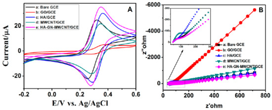 (A) CVs of (A) bare GCE, (b) GO, (c) HA, (d) MWCNT, (e) HA-GN-MWCNT modified GCEs in 1 mM [Fe(CN)6]3−/4− at a scan rate of 50 mV/s. (B) Electrochemical impedance spectra of the corresponding electrodes recorded at the DC potential of 200 mV, AC potential ±5 mV.