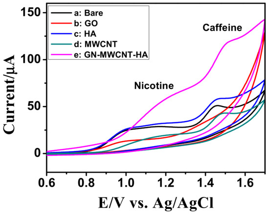 The electrocatalytic oxidation of nicotine and caffeine on HA-GN-MWCNT/GCE was investigated by cyclic voltammetry. Figure 7 shows the CVs recorded at different modified electrodes for 1 mM mixture of nicotine and caffeine in 0.1 M PBS (pH 7.0) at 50 mVs−1.