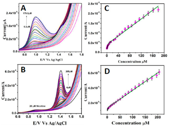 The sensing ability of the HA-GN-MWCNT/GCE for selective determination of nicotine and caffeine was investigated by SWV method in 0.1 M PBS (pH 7.0). Error bars are standard errors from triplicate measurements. The quantification of these analytes had been deduced from measurements carried out in triplicate. As shown in Figure 8A, the oxidation peak currents increased with the increasing concentrations of nicotine in the presence of 75 µM of caffeine, while oxidation peak potentials remained steady under constant stirring. The same behavior was observed for caffeine (Figure 8B). Linear calibration plots were obtained for nicotine (Figure 8C), in the range of 0.3 to 179.5 µM with a LOD of 0.21 µM, and caffeine (Figure 8D). The lowest limit of detection estimated for caffeine was 1.42 µM.