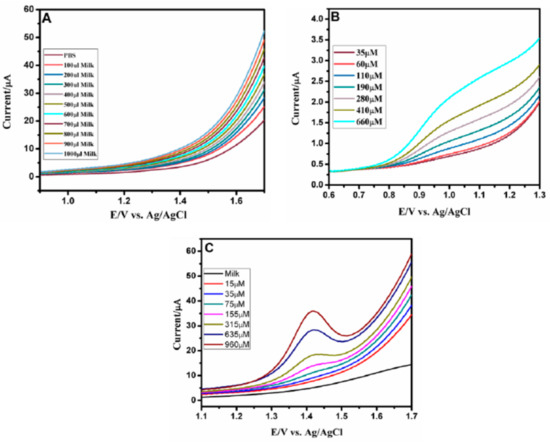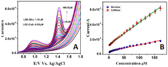 Milk samples were utilized without any pretreatment using SWV method. Before, we tested the possible presence of nicotine and caffeine in these milk samples without the spiking of synthetic samples Figure 10A. There were no obvious peak currents observed for nicotine and caffeine in this analysis, which implies that there is no amount of nicotine and caffeine in milk samples. The developed sensor was then tested to detect nicotine and caffeine in milk samples by standard addition method. Real sample solutions were prepared by adding known concentrations of nicotine and caffeine in milk samples without any pre-treatment. SWV response was measured after the addition of different known concentrations of nicotine and caffeine into the milk sample in 0.1M PBS at pH 7.0 (Figure 10B,C).