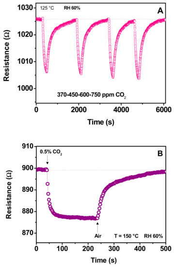 Figure 11 shows the transient response of the sensor at the working temperatures of 125 °C (Figure 11A) and 150 °C (Figure 11B) exposed to CO2 pulses of the duration of 200 s. At the lower temperature tested, the sensor responded to CO2 with a decrease of the resistance, but showed a slow recovery.