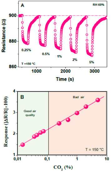The ability of the sensor, operating at the temperature of 150 °C, to detect larger CO2 concentrations, ranging from 0.25% to 5%, is also reported in Figure 12A. The related calibration curve is shown in Figure 12B, where it can be noted the wide dynamic range covered, from less than the CO2 concentration present in fresh ambient air (around 380 ppm) to some percent. As a guide, the CO2 concentration that is permissible in the ambient maintaining good air quality (i.e. less than 0.1% or 1000 ppm), is highlighted in green. In brown is highlighted the region of higher CO2 concentration determining bad air quality.