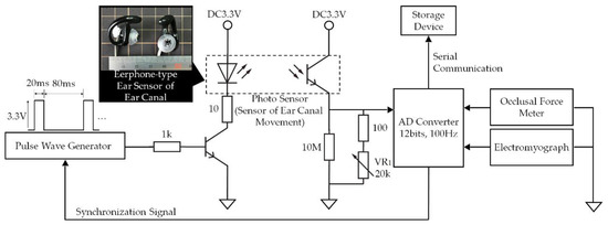 In the experimental system shown in Figure 1, analog signals ranging from 0 V to 3.3 V measured using the earphone-type sensor that we developed to measure ear canal movement (ear sensor), the GM-10 occlusal force meter (Nagano Keiki Co., Nagano, Japan) and the BR-1000 electromyograph (Nishizawa Electric Meters Manufacturing Co., Ltd., Nagano, Japan) are converted into digital signals using an analog-to-digital (AD) converter at a sampling frequency of 100 Hz with 12 bit resolution. These digital signals are then recorded with timestamps using a storage device.