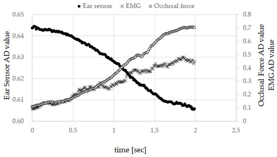 To examine the correlation between the ear canal movement (from the ear sensor), the masseter muscle’s electric potential (from the EMG) and the occlusal force, the measured values from the ear sensor, the EMG, and the occlusal force meter were recorded together with timestamps when the subjects chewed the sensing area of the occlusal force meter thoroughly with their second molar teeth. Each of five subjects described in Section 2.2 performed the following experiment for six runs. In the experiment, a subject is seated in a chair with an ear sensor placed on their right ear to measure the movement of their ear canal; two surface electrodes for detection were placed on their right cheek (where the masseter muscle is located) to measure the EMG and a ground electrode was placed on their right clavicle. After putting on the ear sensor and the electrodes, the subject chews the sensing area of the occlusal force meter thoroughly with their second molar teeth. In the experiment, the subject gradually increases the pressure on the occlusal force sensor for approximately 2 s from the condition under which the sensing part of the occlusal force meter is chewed lightly to the maximum pressure in the 2 s to fix it in their mouth. Then, the pressure is relaxed to return to the initial conditions.