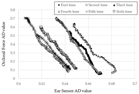 Measurement results for ear sensor and occlusal force over the first through sixth runs for subject A. Here, the horizontal axis represents the ear sensor-measured value, while the vertical axis represents the measured occlusal force value.