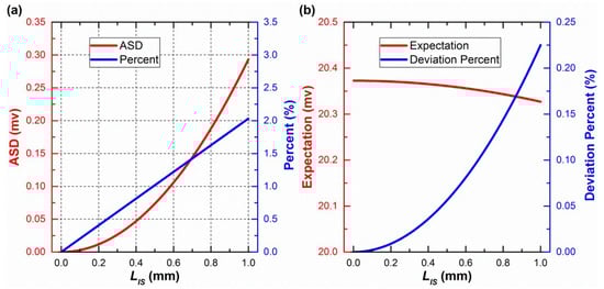 A similar conclusion to the ASD is made that LIS hardly affects expectations, based on the red curve in Figure 11b. Therefore, Figure 12b shows the influence of LS on the expectations of voltage deviation when LS and LIS are between 0.001 and 1 mm. The expectations will be handled in the following calibration part.