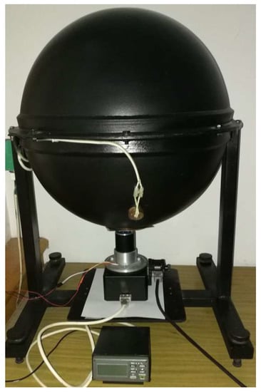 The calibration tools, as shown in Figure 15, include an integrating sphere and a precise rotary table. The integrating sphere provides uniform light, which is unpolarized. A linear polarizer is fixed at the port of the sphere. Then, the light from the sphere becomes linear polarization light after passing through the polarizer. Note that the lamps in the sphere need at least 15 min before using, otherwise the light intensity might not be stable. The model of the sphere is JF-500 (Hefei Xingyue Luminous Technology Applications Institute, Hefei, China). Its diameter is 500 mm. The diameter of its port, where light comes out, is 100 mm. The rotary table, equipped with an optical incremental encoder, has a 1″ accuracy (0.000277°).