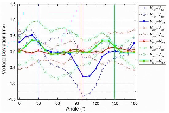 First, the influences of the two eccentric centers (OIS and OS in Figure 7b) on the voltage were analyzed separately. Figure 8a shows the separate influence of OIS, when OS and OR coincide. The voltage deviations between V1ar and V1_ideal, and V1br and V1_ideal can be considered approximate sine curves. It is easy to conclude that the amplitude depends on the eccentric distance (LIS) and the phase depends on the eccentric angle (αIS). The other two groups of voltage deviations were omitted because of the similarity. The voltage deviation between V1mr and V1_ideal was close to 0, which proved the validity of the central-symmetry method preliminarily. Figure 8b shows the separate influence of OS, when OIS and OR coincide. The three deviations between Vmr and Videal seemed constant. Under this condition (LIS = 0 mm), Var was the same as Vbr, according to Equation (5). Therefore, they were both the same as Vmr. The other two groups of deviations were omitted.