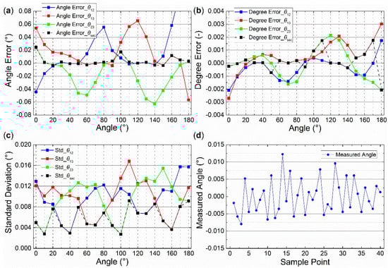 The rotary table stops for 1 s every 10° with an angular speed of 5°/s, and a full range of 360°. As a result, one experiment lasts for 108 s. The values derived from the encoder are considered as “theoretical values”. The mean values of 40 samples at each position were recorded as the measured values.