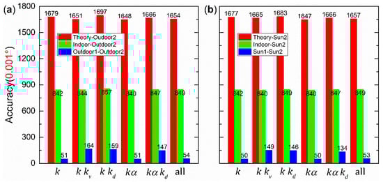 The same replacement method as in Section 4.6 was used to analyze the four calibration parameters. For example, the fifth column “kvkd” of Figure 24a is the accuracy, when outdoor2 kd and kv were replaced with the corresponding theoretical values (0 and 1), indoor or outdoor1 calibration parameters, respectively. The other parameters (α and k) were still the same for outdoor2. The results are divided into two parts, as shown in Figure 24a and Figure 25a, with respect to the calibration parameter k (i.e., ki), because the accuracy was lower when k was replaced. For all the replacements, all the measured data were the same as those in the experiment at 16:43:08. In Figure 24a and Figure 25a, the red, green, and blue columns represent that outdoor2 calibration parameters were replaced with the theoretical values, indoor, and outdoor1 calibration parameters, respectively. In Figure 24b and Figure 25b, the red, green, and blue columns represent that sun2 calibration parameters were replaced with the theoretical values, indoor, and sun1 calibration parameters, respectively.