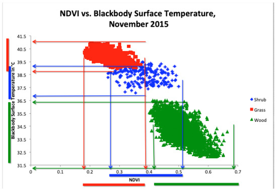 In the November (wet) 2015 image data, when NDVI (x-axis) and BBST (y-axis) were plotted against each other, woodland separated out very well, with the highest NDVI values ranging from 0.4–0.68 and the coolest temperatures ranging between 32.5 °C and 36.4 °C. Grass separated out with the overall lowest NDVI values, between 0.18 and 0.38, and the overall highest temperatures, between 38.6 °C and 41.3 °C. Shrub was in the middle of the graph with overlapping NDVI ranging from 0.28 to 0.51 and overlapping temperatures ranging from 36.7 °C to 39.4 °C. Without plotting these two variables together, grass and shrub would not be clearly separable. The results the boundaries between which NDVI and temperature fell were used to develop an accurate rule-based classification.