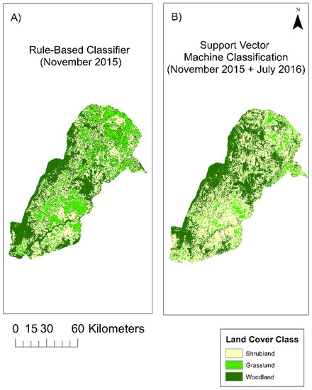 The Support Vector Machine (SVM) classifier, an advanced algorithm, is based off of using machine learning alone, therefore it may have continuous difficulty separating out these classes. While the SVM also had some continuous inputs, such as NDVI, this method did not use the more human-driven technique of creating classification rules, making it less accurate in this heterogeneous landscape. The SVM required multiple images during the water year (from both the wet and dry season) in order to make the products, which ended up with a very low level of accuracy. Relative to the rule-based classification, the SVM under-predicted the grassland class, with probable confusion between shrubland and grassland because the woodland classes were of similar proportions and distributions in both classifications. The overall accuracy of the SVM was 34.48% for the 2015–2016 water year. This is also an important finding, as the assumption that more complex and advanced classification methods result in higher accuracy is untrue for this landscape. Instead, the two simple coverages, NDVI and BBST, were much more superior differentiators of class type and were much less computer intensive and easy to run. These findings are important and especially key for resource-limited and often technology-limited regions of the world.