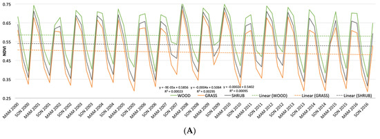These classes separated out very clearly across all seasons and time periods (Figure 7A). Woodland always had the highest NDVI, followed by shrubland in the middle, while grassland always had the lowest mean NDVI. We expected woodland and shrubland values to be more similar because there were some overlapping species across these classes, with only a difference in height and abundance. Therefore, because these two classes were highly separable in this time series, it supported the usefulness of our classification technique. In the woodland class, there was a slight decrease in NDVI over time, whereas there was a slightly greater decrease in shrubland NDVI and a more significant decrease in grassland NDVI over this time period. Overall, while the patterns were highly variable seasonally and year-to-year, there were clear gradual declines in the amount of vegetation cover, especially grassland, over the study period.