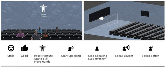 The Presentation Trainer (PT) is an application that allows learners to practice their presentations while receiving feedback regarding basic non-verbal communication aspects for public speaking. In the original version of the PT, while the learner practices the presentation, the PT displays on a computer screen her mirrored image. Based on the current learner’s performance, the PT displays a maximum of one feedback instruction at a given time. The feedback displayed concerns the learner’s posture, use of gestures, voice volume, speaking time and use of pauses, phonetic pauses (filler sounds), and facial expressions (smiles). After practicing the presentation, the PT provides learners with a self-reflection module where it displays the analysis of the data tracked during the presentation allowing learners to self-reflect about their performance [25]. For this study, we added two new features to the PT: a VR real-time feedback module and a post-practice histogram and video analysis.