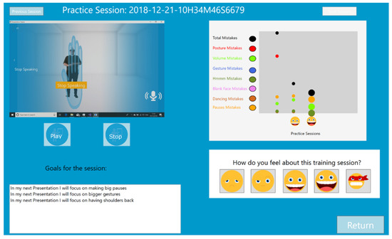 The original interface of the PT constantly displays the mirrored image of the learner, raising the level of self-awareness. This original support of self-awareness is not presented in the VR Module. To support self-awareness this new version of the PT automatically records a video of the practice session, which can be reviewed in the new Post-Practice histogram and video analysis module (See Figure 2). This module provides learners with three new options. First, it allows learners to review the videos of their practice sessions. Second, it allows learners to look at the development of their performance, based on the objective measurements (percentage of time spent on mistakes) tracked by the PT. Third, it allows learners to rate their performance because according to experts in public speaking ultimately only the presenter is the one who can assess if the presentation went as planned [37].