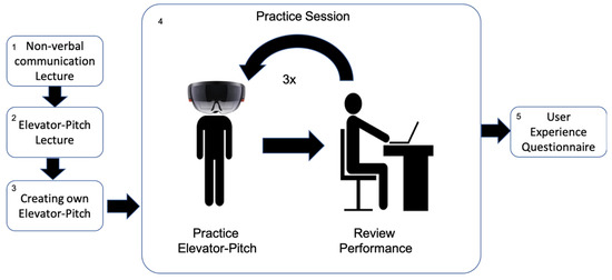 Each user test session in this study was individual. The procedure of each session (see Figure 4) starts with a brief lecture about non-verbal communication for public speaking. This lecture intends to explain to participants how to interpret and adapt their behavior based on the feedback provided by the VR module. The procedure continues with a second brief lecture about the creation of an Elevator Pitch. An Elevator Pitch is a 30 to 120 s long speech where a speaker introduces themselves, summarizes in lay terms what they do and explains why it is important. Next, participants have five minutes to create their pitch.