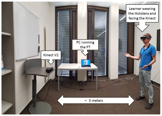 The next stage of the test comprises three consecutive practice sessions. Each practice session consists of participants practicing their Elevator Pitch using the VR module of the PT and reviewing their performance afterward. Participants practice the Elevator Pitches while wearing the Hololens and standing between two to three meters in front of the Kinect (see Figure 5). The calibration process for the practice of the Elevator Pitches is as follows. Before the sessions, the experimenters adjusted the volume thresholds for the room where the user tests take place and the expected distance between the participants and the Kinect sensor. This calibration is sufficient for the analysis of the voice volume and speaking time performed by the PT. To calibrate the VR room according to the height and gaze direction of the participant, the participant has to wear the Hololens, stand in the right position facing the Kinect sensor, and finally has to start manually the VR module.