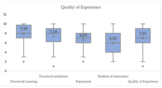 The user tests also revealed some insights into how learners experience practicing their presentations with the PT and its new features (the VR module and the post-practice histogram and video analysis), thus providing answers to our RQ2. The overall QoE for interacting with the PT reported by the participants was relatively high, especially regarding the perceived learning and usefulness of the system, which we consider to be the most important aspects of the application.