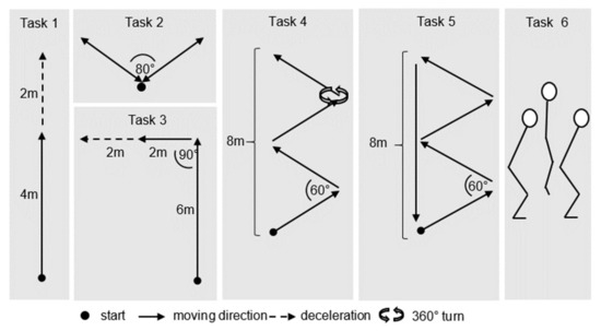 Data were collected during the performance of six team sport-specific movements adopted from Luteberget and colleagues [] (Figure 1) after a standardized warm-up. All tasks were performed with and without ball handling. Under both conditions, participants performed each task (except for Task 6) at three intensity levels ranging from low, moderate, to high intensity, based on the athlete’s perceived effort. Task 6 was a maximum vertical jump performed at high intensity only. A total of 1120 trials were recorded. Twenty-seven trials had to be excluded from further analysis due to insufficient data quality. The resulting number of trials (1093) was sufficient for the power analysis calculated a priori based on previously-reported results by our working group [].