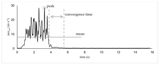 Convergence time was calculated referring to baseline ranges for CF, MA, and KF, which were defined as the corridor between the upper and lower bounds of the mean ± 2SD during the last 3 s of the waiting phase after movement execution. The start of convergence was defined as the time point when the last value exceeded the baseline level +2.5 m·s−2 of the 100 Hz MA data. This threshold was chosen as this amount of acceleration was physically related to actual movements of the athlete rather than reflecting respiratory-induced torso movements. Further, values of 2.5 m·s−2 were also reached during lower intensities, which makes this threshold appropriate for all performed intensities of motion and inter-athlete variation in movement execution. Convergence time was then calculated as total time elapsed until the signal dropped back to the predefined baseline range (Figure 2).