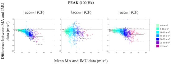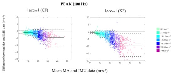 Bland–Altman plots showing the relationship between motion analysis (MA) and IMU data using Complementary Filter (CF) and KF for peak values at the 100 Hz temporal resolution. Mean and peak values for each trial were categorized according to pre-defined bands. For each acceleration band, 95% limits of agreement (LoA) (dashed line) and mean bias (solid line) are displayed with reference to zero (black solid line).