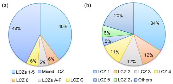 Figure 4b, indicating that LCZ 1 takes the largest part, followed by the mix of any two types and LCZs 2–4.