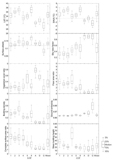 22] on a comparison of 50 cities. All of the median SUHI intensities in the built-up zones showed positive values and negative values for the natural LCZs. The mixed LCZ showed the median between that of the built-up and natural LCZs and the largest variation.