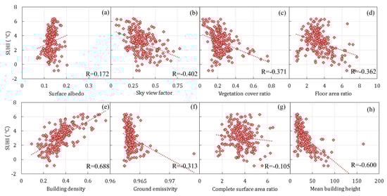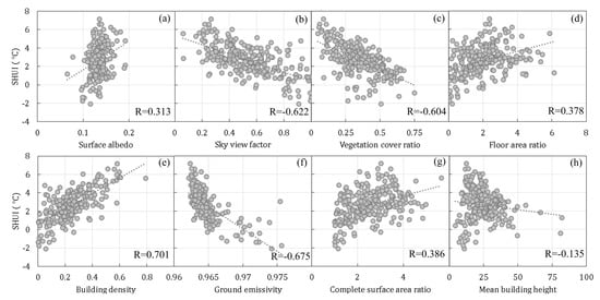 Figure 8. The factors of surface albedo and building density showed positive correlations with the summer daytime SUHI, while other factors showed negative correlations. The changing tendencies of the factors of vegetation cover ratio, floor area ratio, building density, ground emissivity, mean building height, and complete surface area ratio are in good agreement with the previous findings in