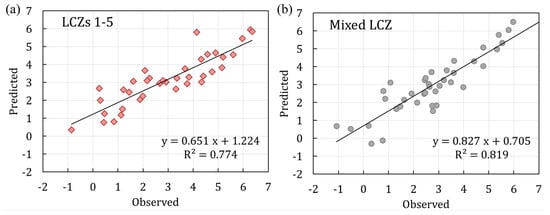 2 of 0.774 and 0.819 for the models of LCZs 1–5 and the mixed LCZ, respectively. The RMSE values were obtained as 0.95 °C and 0.81 °C for the LCZs 1–5 and mixed LCZ models, respectively, showing a satisfactory performance. A value of d close to 1.0 indicates that the model prediction approaches the observed variable. The d values of the LCZs 1–5 and mixed LCZ models were determined to be 0.91 and 0.94, respectively, indicating that the prediction models could effectively predict the changes of SUHI with LCZs.